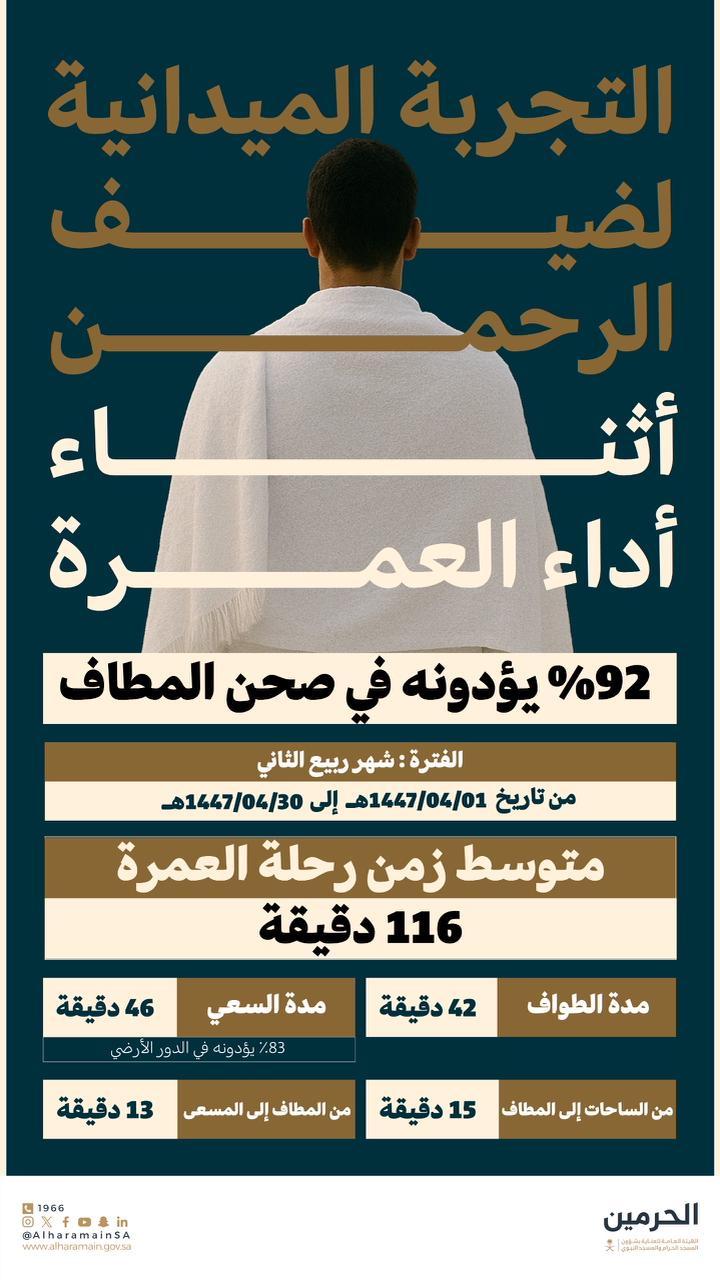 أصدرت الهيئة العامة للعناية بشؤون المسجد الحرام والمسجد النبوي الشريف إحصائيات عن رمن ادى مناسك العمرة خلال شهر ربيع الثاني لعام 1447 هجرية بأنه تم تسجيل الزمن الفعلي لأداء مناسك العمرة 116 دقيقة حيث يستغرق مدة الطواف (42) دقيقة كما يستغرق مدة السعي (46) دقيقة الزمن من ساحات الحرم المكي الشريف إلى صحن المطاف (15) دقيقة كما أن الزمن من صحن المطاف إلى السعي (13) دقيقة، وبذلك يكون المدة الفعلية لأداء مناسك العمرة( 116) دقيقة كما أن 83٪ يفضلون أداء السعي في الدور الأرضي فيما بلغ 92٪ من المعتمرين أدّوا الطواف في صحن المطاف.