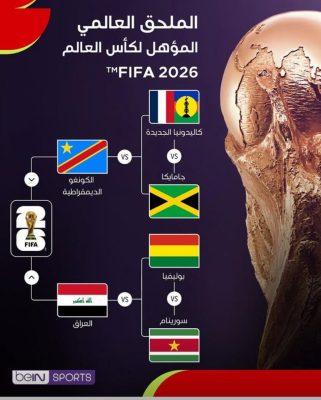 وفي القرعة التي جرت في مدينة زيورخ السويسرية أسفرت عن وقوع الكونغو الديمقراطية في المسار الاول حيث تشارك في نهائي الملحق مباشرة إذ يلعب مع الفائز من مباراة نصف النهائي التي تقام بين كالديونا الجديدة وهي من قارة أوقنيوسيا ضد جامايكا من الكاريبي وفي المقابل جاء منتخب العراق في المسار الثاني حيث يخوض نهائي الملحق مباشرة وسوف يلعب مع الفائز من مباراة نصف النهائي الآخر التي تجمع بين منتخبي بوليفيا وسورينام من منطقة الكاريبي ومن المقرر أن يصعد الفائزان من الدور النهائي مباشرة للمونديال ليكتمل العدد 48 منتخباً ونتمنى للمنتخب العراقي الشقيق التأهل لكأس العالم.