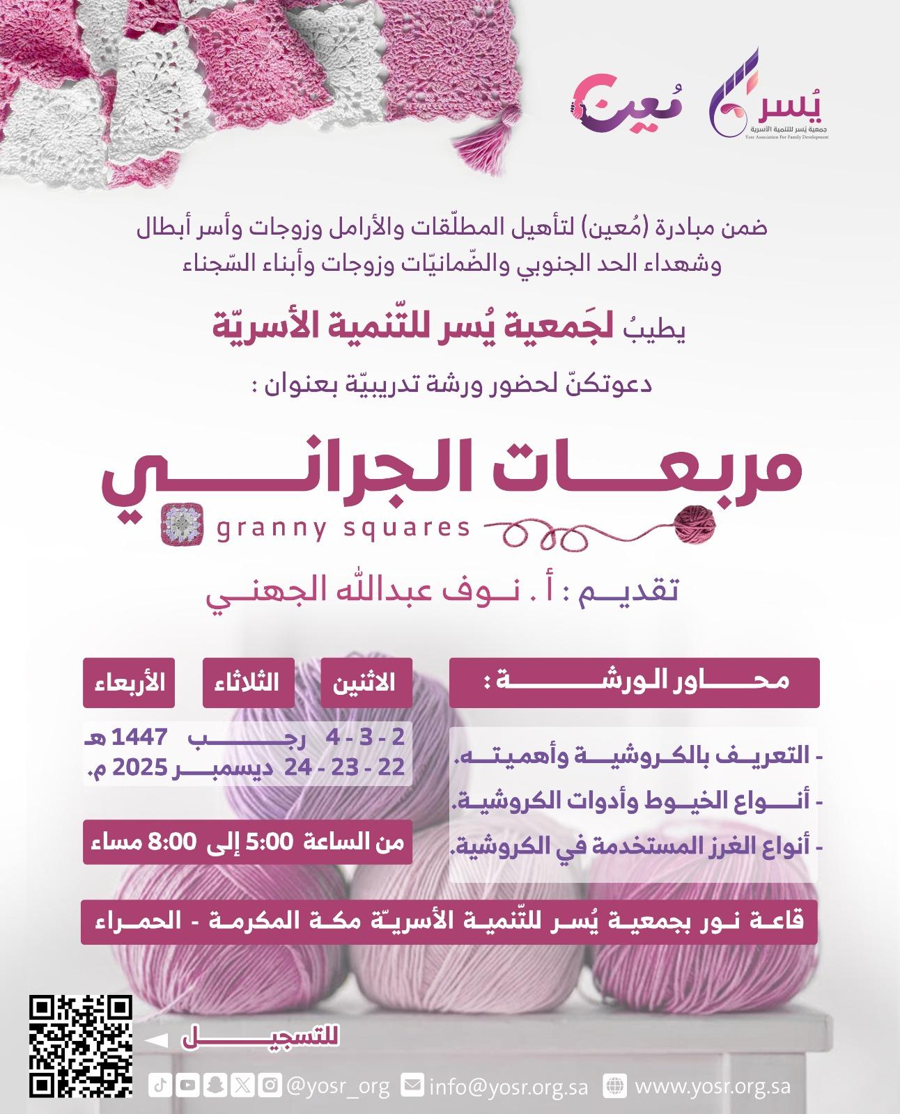 ضمن الأنشطة والبرامج والفعاليات والمبادرات التي تقوم بها جمعية يسر للتنمية الأسرية بمكة المكرمة وضمن مبادرة (مُعين) لتأهيل المطلّقات والأرامل وزوجات وأسر أبطال وشهداء الحد الجنوبي والضّمانيّات وزوجات وأبناء السّجناء : نظمت الجَمعية ورشة تدريبيّة بعنوان ( مربعات الجراني ).
