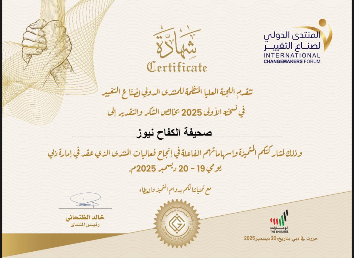 المنتدى الدولي لصناع التغير في إمارة دبي – يكرم صحيفة الكفاح نيوز بشهادة – كتب فيها – تتقدم اللجنة المنظمة للمنتدى الدولي لصناع التميز في نسخته الأولى 2025 بخالص الشكر والتقدير إلى – صحيفة الكفاح نيوز – وذلك لمشاركتها المتميزة واسهاماتهم الفاعلة في إنجاح فعاليات المنتدي الذي عقد في إمارة دبي يومي 19-20 ديسمبر 2025 مع تمنياتنا لكم بدوام التميز والعطاء.