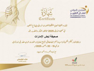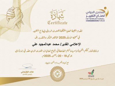 منح المنتدى الدولي لصنّاع التغيير في نسخته الأولى لعام 2025، الأستاذ محمد عبدالمجيد علي، رئيس تحرير صحيفة نبض الإمارات، شهادة شكر وتقدير، وذلك تقديرًا لدوره الإعلامي البارز ومشاركته الفاعلة في تغطية ودعم فعاليات المنتدى.