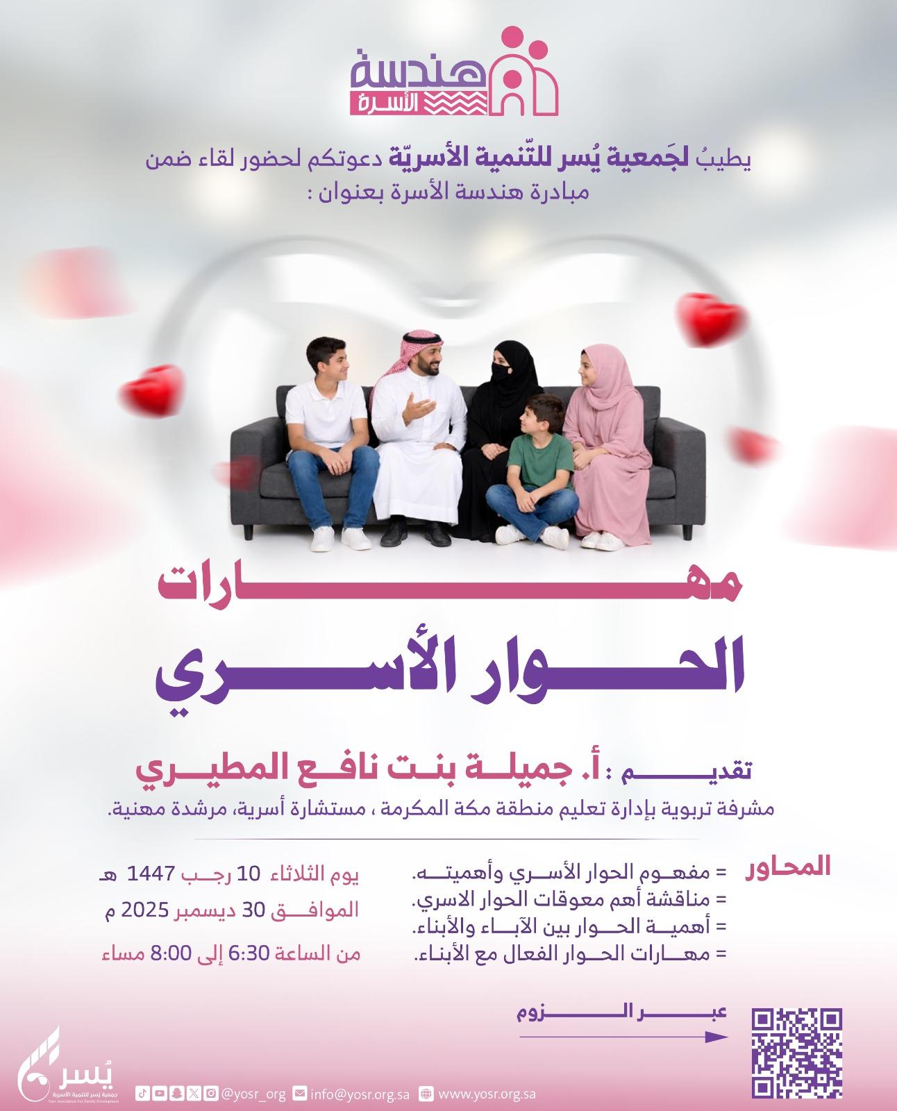 ضمن الأنشطة والبرامج والفعاليات التوعوية والتثقيفية التي تقيمها جَمعية يُسر للتّنمية الأسريّة بمكة المكرمة تقيم الجمعية لقاء ضمن مبادرة هندسة الأسرة بعنوان : (مهارات الحوار الأسري).