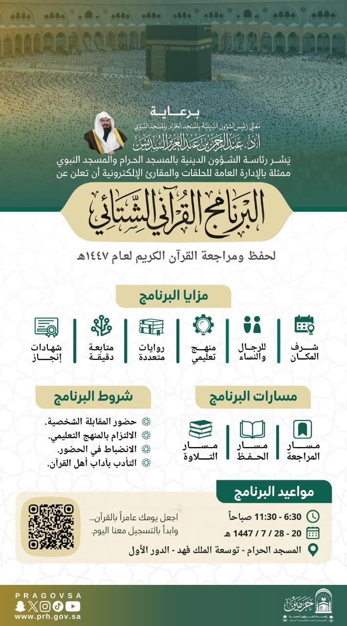 أوضحت رئاسة الشؤون الدينية بالمسجد الحرام والمسجد النبوي عن إقامة البرنامج القرآني الشتائي في رحاب المسجد الحرام خلال الفترة من 20 إلى 28 رجب 1447هـ