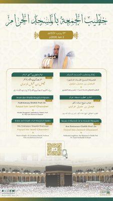 حددت رئاسة الشؤون الدينية بالمسجد الحرام والمسجد النبوي، خطيبا وإماما صلاة الجمعة في الحرمين الشريفين ليوم بعد غد 13 رجب 1447هـ وذلك ضمن جدولها الدوري لتنظيم الإمامة والخطابة.