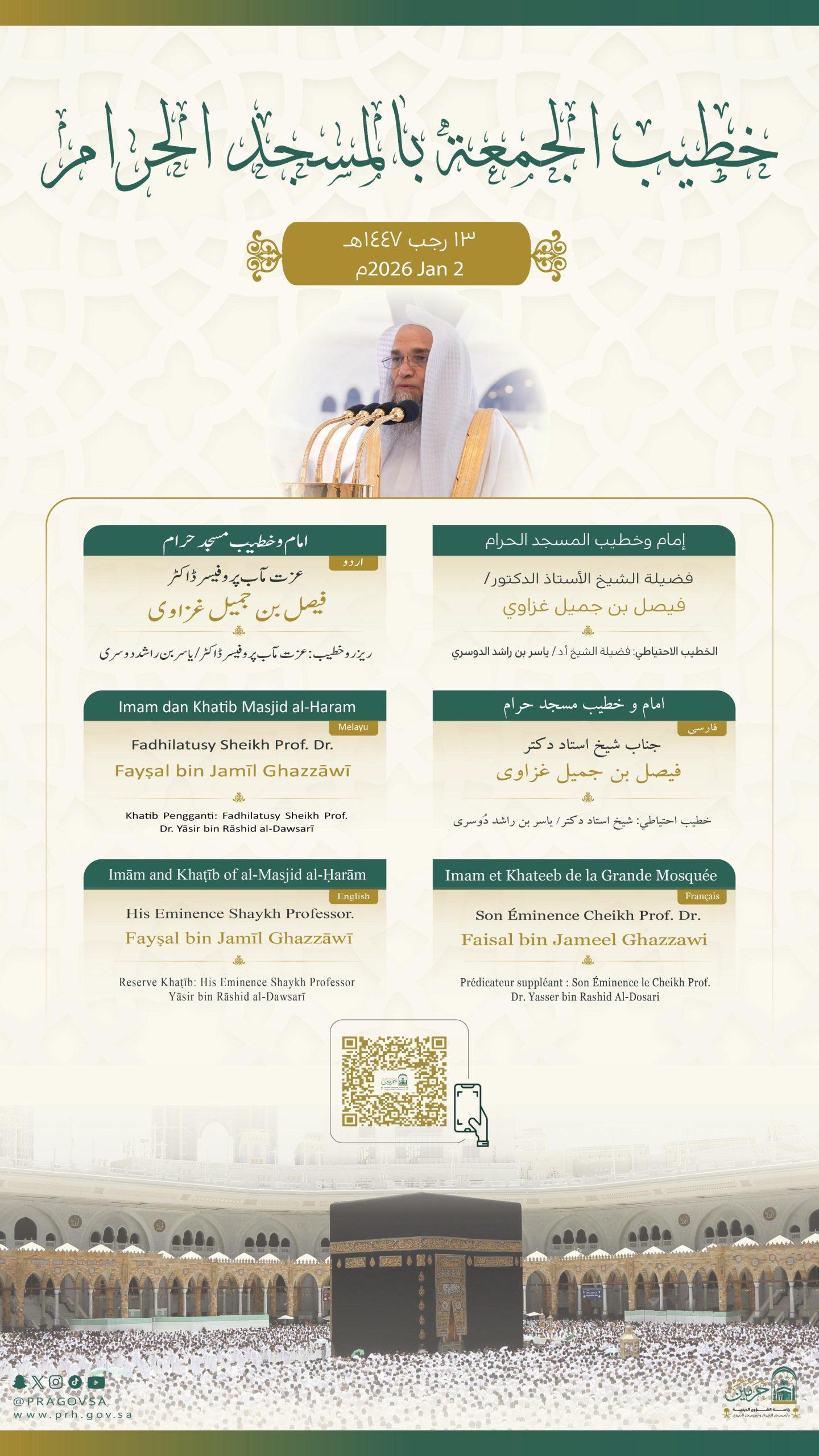 وسيتولى فضيلة الشيخ الأستاذ الدكتور فيصل بن جميل غزاوي إمامة المصلين وإلقاء خطبة الجمعة في المسجد الحرام.