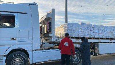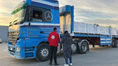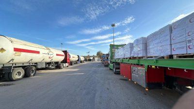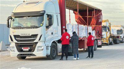 وفي العريش، واصل المتطوعون على تجهيز قافلة «زاد العزة .. من مصر إلى غزة» رقم 107، والتي جرى الدفع بها صباح اليوم الباكر بحمولة تجاوزت 5,100 طن من المساعدات الإنسانية الشاملة، والتي تضمنت: سلال غذائية ودقيق، مستلزمات إغاثية وعناية شخصية، إضافة إلى المواد البترولية، وإمدادات الشتاء الأساسية التي شملت: بطاطين، مراتب، ملابس شتوية، و خيم لإيواء المتضررين.
