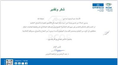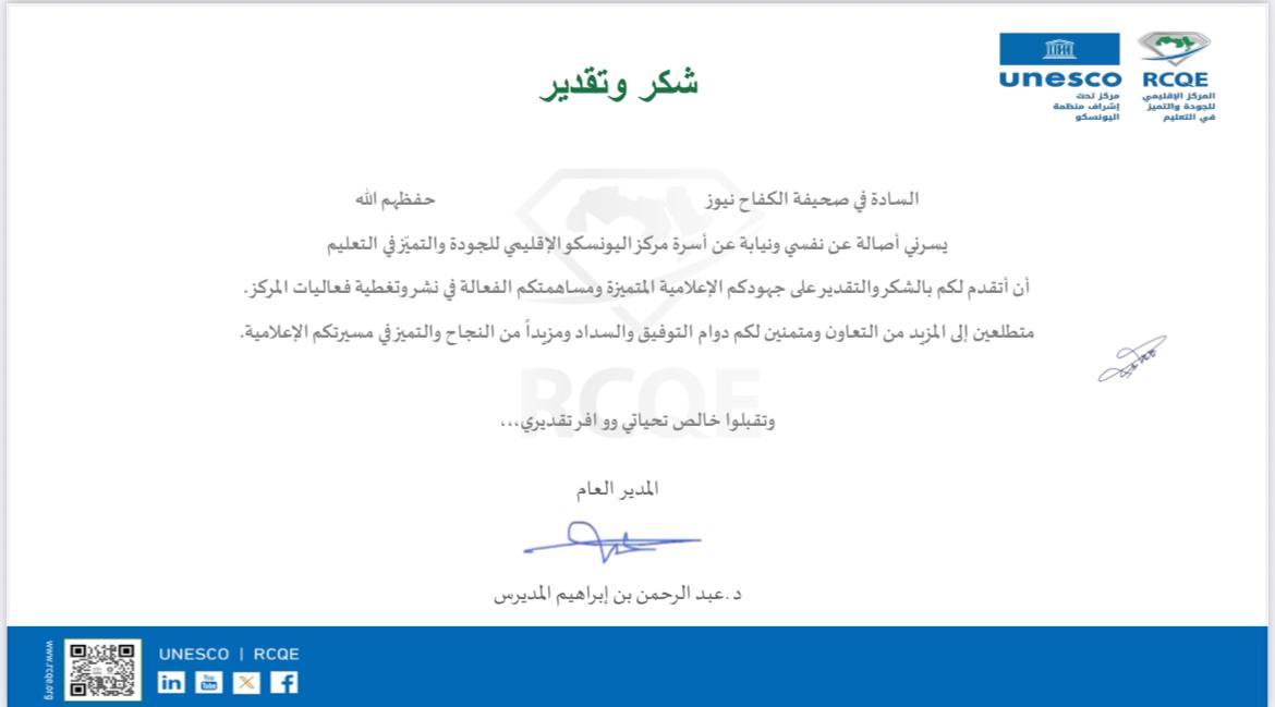 المركز الإقليمي للجودة والتميز في التعليم مركز تحت إشراف منظمة اليونسكو يكرم صحيفة الكفاح نيوز ورئيس التحرير بشاهدتين شكر وتقدير جاء فيها – السادة نيابة عن أسرة مركز اليونسكو الإقليمي للجودة والتميز في التعليم أن أتقدم لكم بالشكر والتقدير على جهودكم الإعلامية المتميزة ومساهمتكم الفعالة في نشر وتغطية فعاليات المركز متطلعين إلى المزيد من التعاون ومتمنين لكم دوام التوفيق والسداد ومزيد من النجاحات والتميز في مسيرتكم الإعلامية.