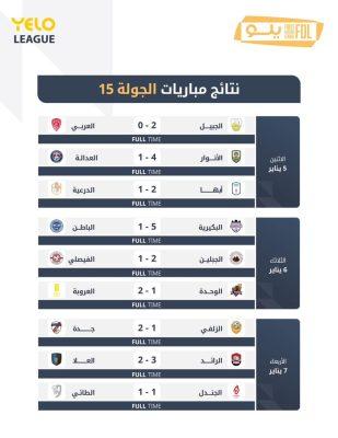 اختتمت الأربعاء منافسات الجولة الخامسة عشر من دوري يلو للمحترفين والتي شهدت مواجهات قوية على رأسها قمة الدوري التي حسمها أبها أمام الدرعية، والريمونتادا المثيرة التي حققها الرائد أمام ضيفه العلا.
