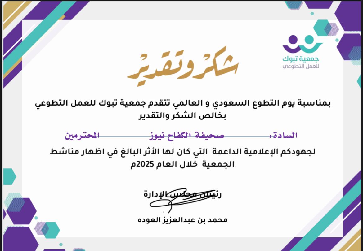 شرفتنا جمعية تبوك للعمل التطوعي بتبوك بتكريم صحيفة الكفاح نيوز بشهادة شكر وتقدير ، نراها من جانبنا وسام نفخر به ، ودعوة لمواصلة العمل بجد واجتهاد لتقديم المزيد من الأعمال الصحفية المميزة.