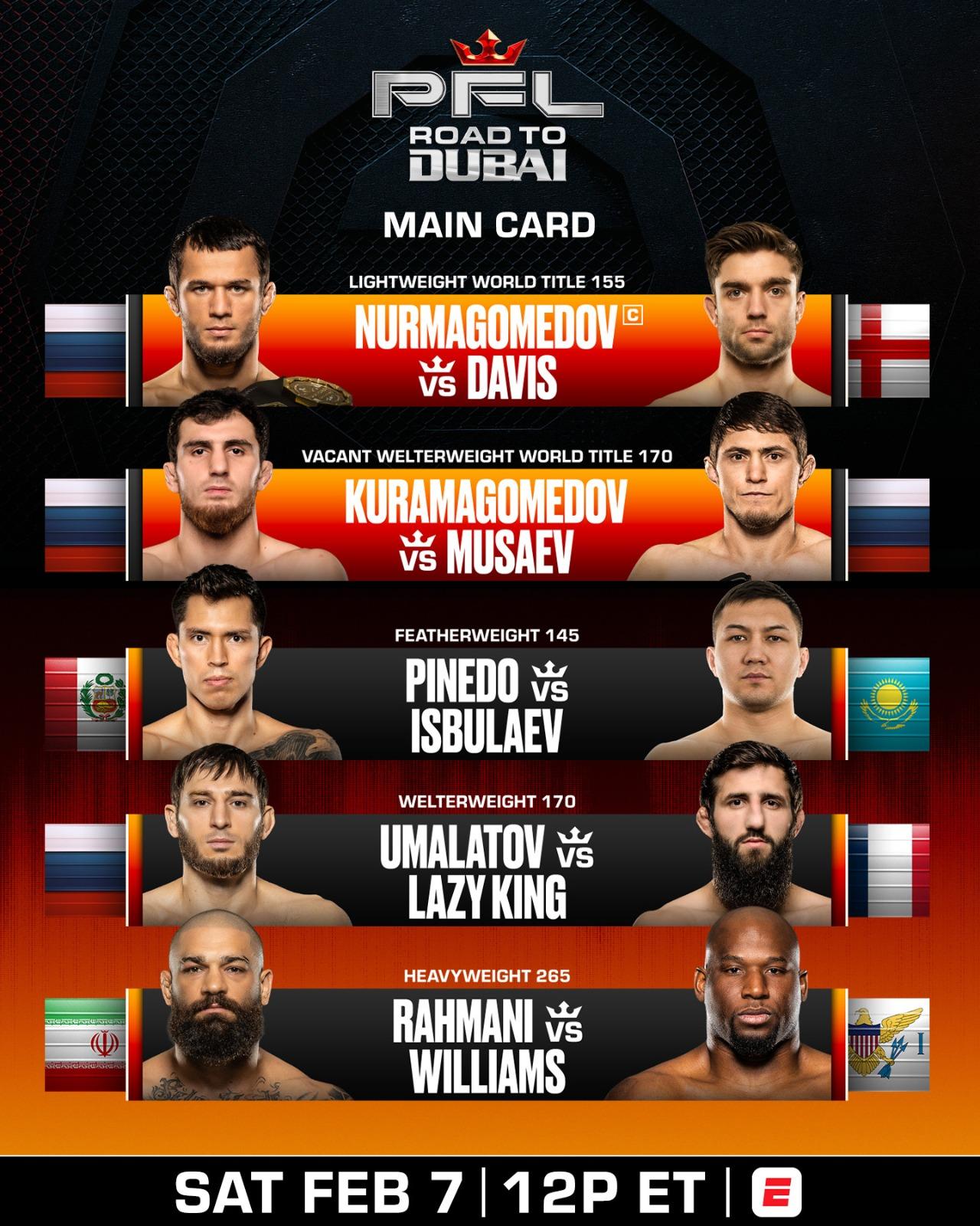 وتضم البطاقة الرئيسية كذلك نزال وزن الريشة الذي يجمع خيسوس بينيدو مع سلامات إسبيلاييف، إلى جانب مواجهة في وزن الوسط بين مغومد أومالاتوف وعبدول عبدوراغيموف، فيما يشهد وزن الثقيل نزالًا يجمع بويا رحماني مع كارل ويليامز.