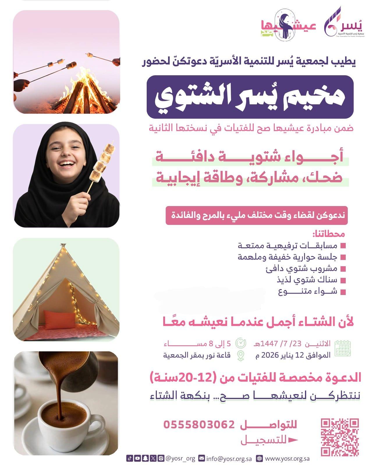 ضمن الأنشطة والبرامج والفعاليات التوعوية والتثقيفية التي تقيمها جمعية يُسر للتنمية بمكة المكرمة تنظم الجمعية مخيم يُسر الشتوي ضمن مبادرة عيشيها صح للفتيات في نسختها الثانية في أجواء شتوية دافئة، يشمل المخيم عدد من الفعاليات: فعالية فكاهية مشاركة، وطاقة إيجابية.