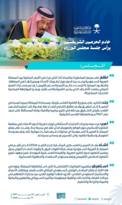 وجدّد مجلس الوزراء في هذا السياق التأكيد على محورية القضية الفلسطينية، ومساندة المملكة جميع المساعي الرامية إلى تحقيق وقف إطلاق النار في قطاع غزة؛ وصولًا إلى تمكين الشعب الفلسطيني الشقيق من حقه في تقرير مصيره وإقامة دولته المستقلة على حدود عام 1967م وعاصمتها القدس الشرقية.