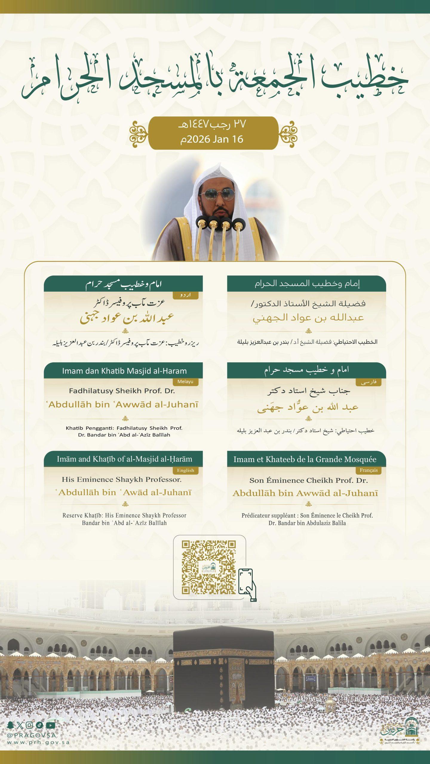 أوضحت رئاسة الشؤون الدينية بالمسجد الحرام والمسجد النبوي، أسماء خطيبا وإماما صلاة الجمعة في الحرمين الشريفين 27 رجب 1447هـ وذلك ضمن جدولها الدوري لتنظيم الإمامة والخطابة.