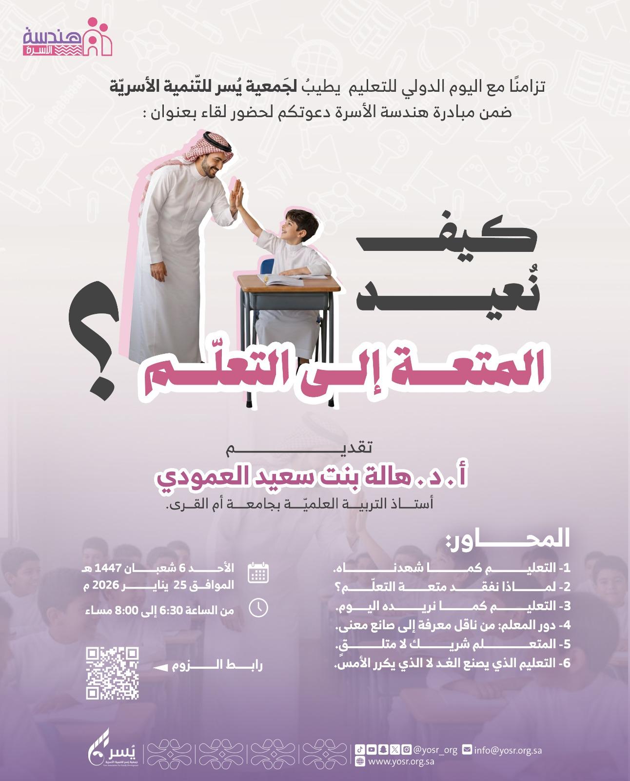 تزامنًا مع اليوم الدولي للتعليم تقيم جمعية يسر للتنمية الأسرية بمكة المكرمة لقاء ضمن مبادرة هندسة الاسرة اللقاء بعنوان