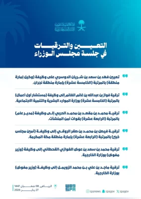 الموافقة على تعيين وترقيات إلى المرتبتين (الخامسة عشرة) و(الرابعة عشرة) ووظيفة (وزير مفوض)، وذلك على النحو الآتي: