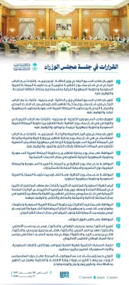 واطّلع مجلس الوزراء على الموضوعات المدرجة على جدول أعماله، من بينها موضوعات اشترك مجلس الشورى في دراستها، كما اطّلع على ما انـتهى إليه كل من مجلسي الشؤون السياسية والأمنية، والشؤون الاقتصادية والتنمية، واللجنة العامة لمجلس الوزراء، وهيئة الخبراء بمجلس الوزراء في شأنها، وقد انتهى المجلس إلى ما يلي: