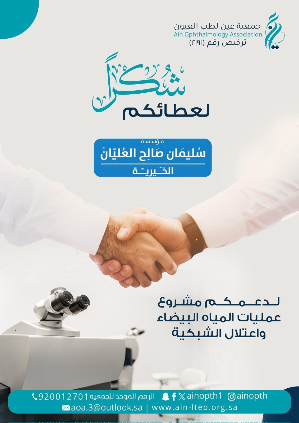 أطلقت جمعية عين لطب العيون مشروع عمليات المياه البيضاء واعتلال الشبكية، بدعم كريم من مؤسسة سليمان صالح العليان الخيرية، وذلك ضمن جهودها المستمرة لتعزيز صحة العيون والحد من مسببات ضعف وفقدان البصر لدى المستفيدين.