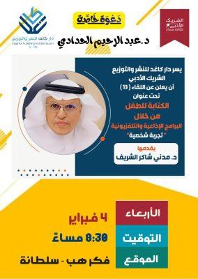 أقيم مساء أمس لقاء تحت عنوان ( الكتابة للطفل من خلال البرامج الإذاعية والتلفزيونية ) في أحد المقاهي الثقافية بالمدينة المنورة قدمها الدكتور – مدني شاكر الشريف كاتب أناشيد برنامج أطفال المدينة المشهور قبل 50 عاما ،وحضرها مجموعة من المهتمين من أهالي المدينة المنورة ومن رجال الصحافة والإعلام.