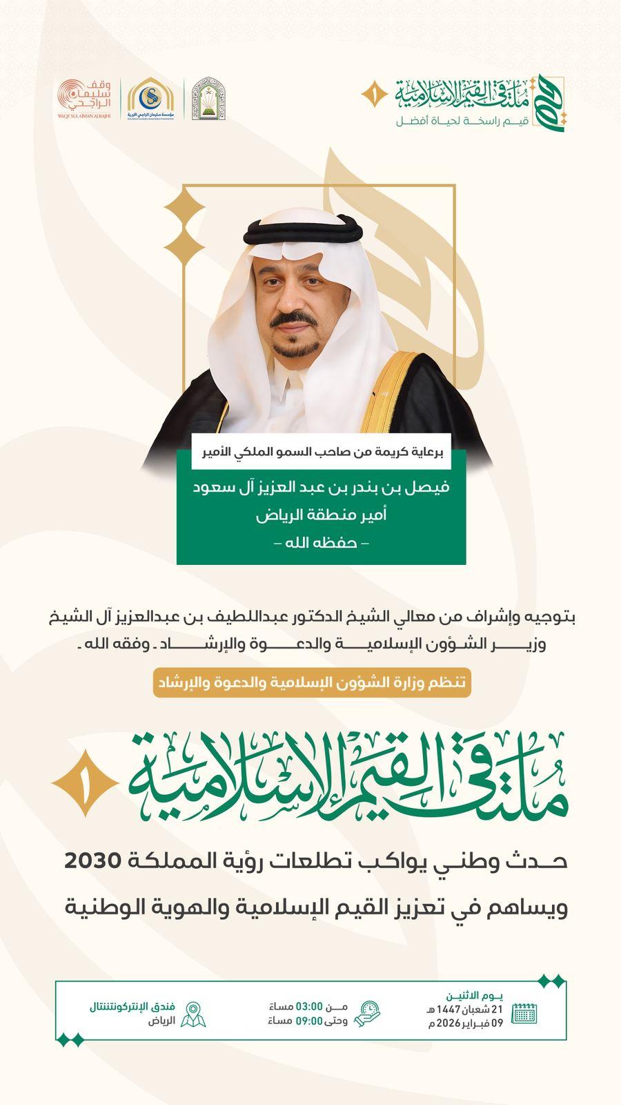 أتاحت وزارة الشؤون الإسلامية والدعوة والإرشاد البث المباشر لانطلاق أعمال ملتقى القيم الإسلامية في نسخته الأولى، اليوم الاثنين الحادي والعشرين من شهر شعبان 1447هـ، من مدينة الرياض، وذلك في فندق الإنتركونتننتال، برعاية كريمة من صاحب السمو الملكي الأمير فيصل بن بندر بن عبدالعزيز أمير منطقة الرياض – حفظه الله –، وبتوجيه وإشراف معالي وزير الشؤون الإسلامية والدعوة والإرشاد الشيخ الدكتور عبداللطيف بن عبدالعزيز آل الشيخ.