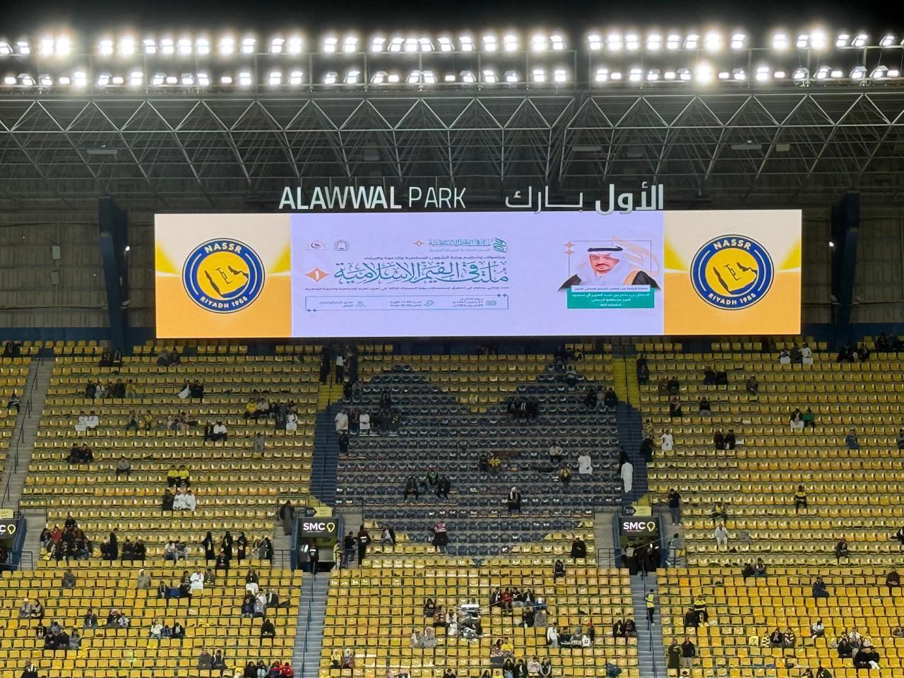 في إطار الجهود الإعلامية للتعريف بـ«ملتقى القيم الإسلامية الأول»، وبالتعاون مع وزارة الرياضة، بثّت وزارة الشؤون الإسلامية والدعوة والإرشاد الإعلانات التعريفية بالملتقى عبر الشاشات الرقمية في ملاعب مباريات دوري روشن السعودي، في خطوة اتصالية نوعية هدفت إلى توسيع نطاق الوصول الجماهيري وتعزيز الوعي برسالة الملتقى وأهدافه، حيث حققت الحملة أصداءً واسعة وتفاعلًا لافتًا، عكست أهمية الملتقى بوصفه حدثًا وطنيًا كبيرًا يُعنى بترسيخ القيم الإسلامية وتعزيز حضورها المجتمعي، تحقيقًا لمستهدفات رؤية المملكة 2030.