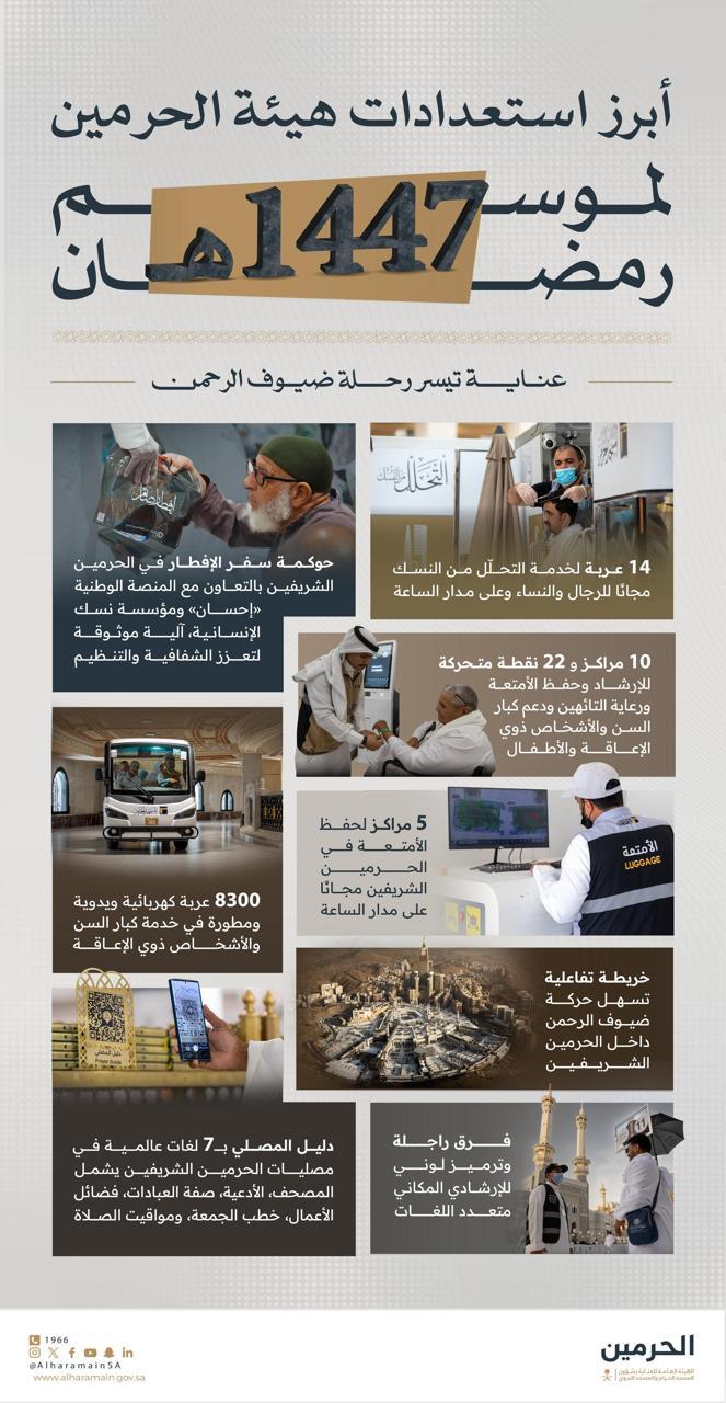 وتستند الهيئة في خطتها التشغيلية لهذا الموسم إلى حزمة من المشاريع النوعية والإثرائية الجديدة، لتعزيز جودة الخدمات ورفع كفاءة التشغيل، وتحقيق أعلى معايير السلامة والاعتمادية في الحرمين الشريفين، من خلال أبرز المبادرات الجديدة والمطورة: تفعيل الخرائط التفاعلية ثلاثية الأبعاد في الحرمين الشريفين لتسهيل وصول الزوار إلى المرافق والمسارات بكل يسر وسهولة، وإطلاق خدمة نقل كبار السن من محطات النقل لضمان راحتهم وسهولة تنقلهم، وتفعيل أنظمة تعداد الزوار عبر حساسات ومستشعرات رقمية تسهم في توفير بيانات دقيقة تدعم التنظيم الأمثل وإدارة الحشود، وأيضًا تفعيل أجهزة قياس رضا الزوار لرصد مستوى الرضا وتحسين الخدمات بشكل مستمر، إلى جانب تطوير وتشغيل الشاشات الإرشادية التفاعلية داخل المسجد الحرام وساحاته، التي تقدم خدمات توجيهية بخمس لغات، وإطلاق نسخة محدثة من دليل المصلي بمحتوى شامل وتقنيات تفاعلية، وتشغيل المركز الهندسي للقيادة في الحرمين الشريفين لمتابعة العمليات التشغيلية ورفع كفاءة الاستجابة الميدانية، وتعزيز الإرشاد المكاني عبر الفرق الراجلة باستخدام الترجمة الفورية، وتسهيل تحديد المواقع من خلال ترقيم الأبواب داخل المسجد الحرام، إضافة إلى تفعيل خدمة «بلاغات راصد» لتعزيز سرعة الاستجابة للملاحظات والمقترحات.