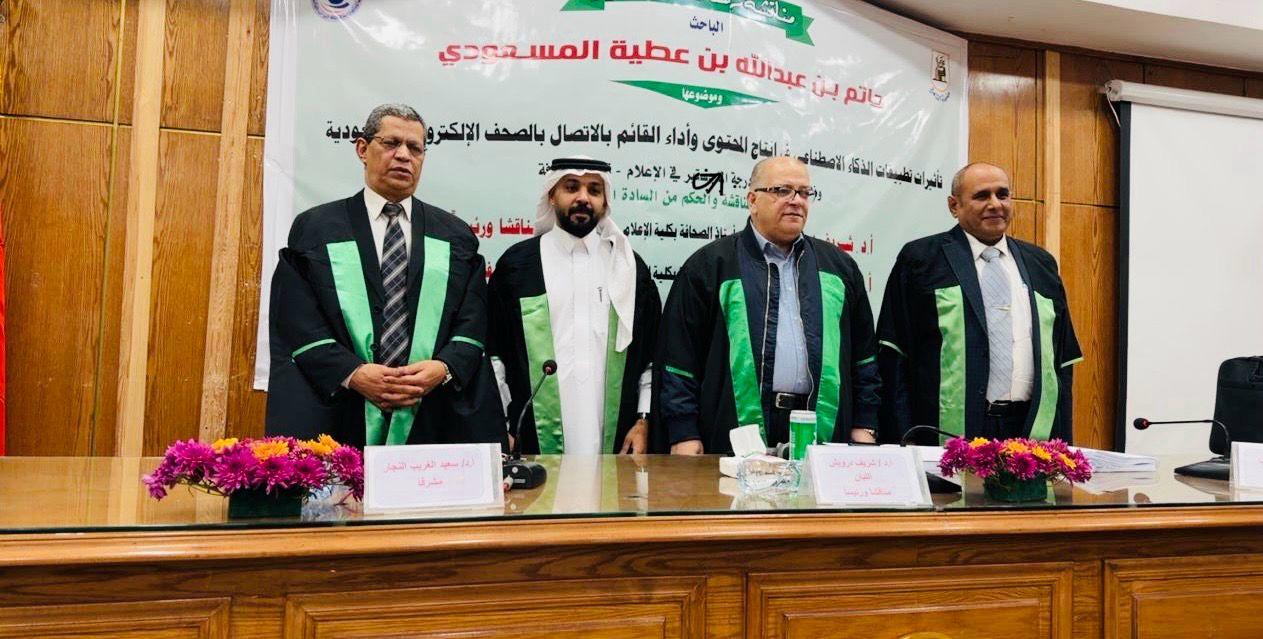 حصل الباحث والإعلامي السعودي الدكتور – حاتم بن عبدالله بن عطية المسعودي على درجة الدكتوراه في الإعلام (قسم الصحافة) من كلية الإعلام – جامعة القاهرة، وذلك بعد مناقشة أطروحته العلمية التي جاءت بعنوان: «تأثيرات تطبيقات الذكاء الاصطناعي في إنتاج المحتوى وأداء القائم بالاتصال بالصحف الإلكترونية السعودية»، ومنحته لجنة المناقشة والحكم الدرجة مع مرتبة الشرف الأولى.