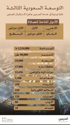 ومن جهة ثانية هيئات الهيئة التوسعة السعودية الثالثة بالمسجد الحرام لإستقبال المصلين من خلال تغطيتها بالخدمات المتكاملة وتوفير بيئة إيمانية مهيأة بكامل تفاصيلها إضافة إلى إتاحة الأدوار الأرضي الثاني والأول الثالث للميزانين والأول ميزانين إضافة للسطح وتوفير كافة الخدمات من فرش وتبريد وسماعات وحافظات لماء زمزم ودورات مياه ومواضيء ومشربيات وسلالم كهربائية و120 مصلى و38 مصعد وعدد 80 باب.