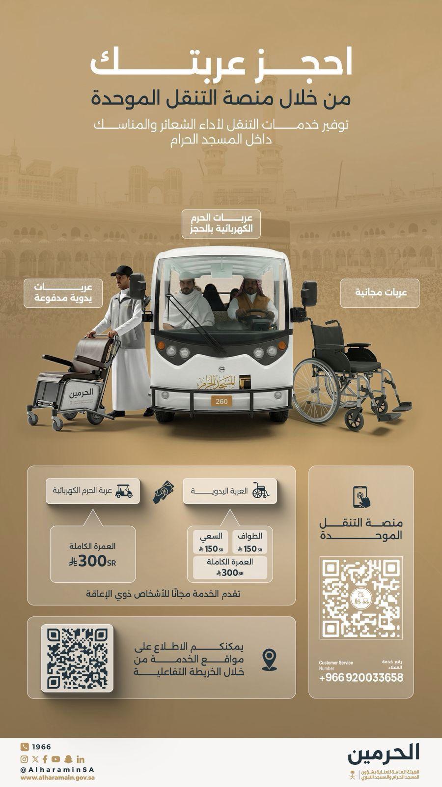 وفرت الهيئة العامة للعناية بالحرمين الشريفين عربات كهربائية ويدوية بالدفع لتنقل كبار السن والأشخاص ذوي الإعاقة داخل المسجد الحرام تحت شعار احجز عربيتك وذلك بهد ف راحة وخدمة هؤلاء حيث وفرت لهم خدمات التنقل لأداء الشعائر والمناسك وهذه العربات بأسعار مناسبة فالطواف ب 150 ريال وكذلك السعي أما العمرة كاملة فهي ب 300 ريال.