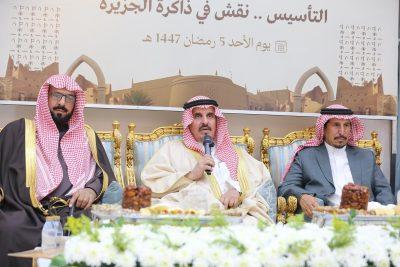 وألقى رئيس مركز المعتلا القديم المخاريم جلعود بن محمد بن ربيع ، كلمة الأحفاد، رحّب فيها بالحضور، مؤكداً أن يوم التأسيس يمثل محطة وطنية راسخة تعزز قيم الانتماء والولاء، مستذكراً الجهود التاريخية للإمام محمد بن سعود في بناء الدولة السعودية الأولى وترسيخ قواعدها، ومشيراً إلى أن الأسرة تستلهم من سيرة جدهم ربيع بن زيد المخاريم الدوسري معاني الإخلاص والوفاء للوطن وقيادته.