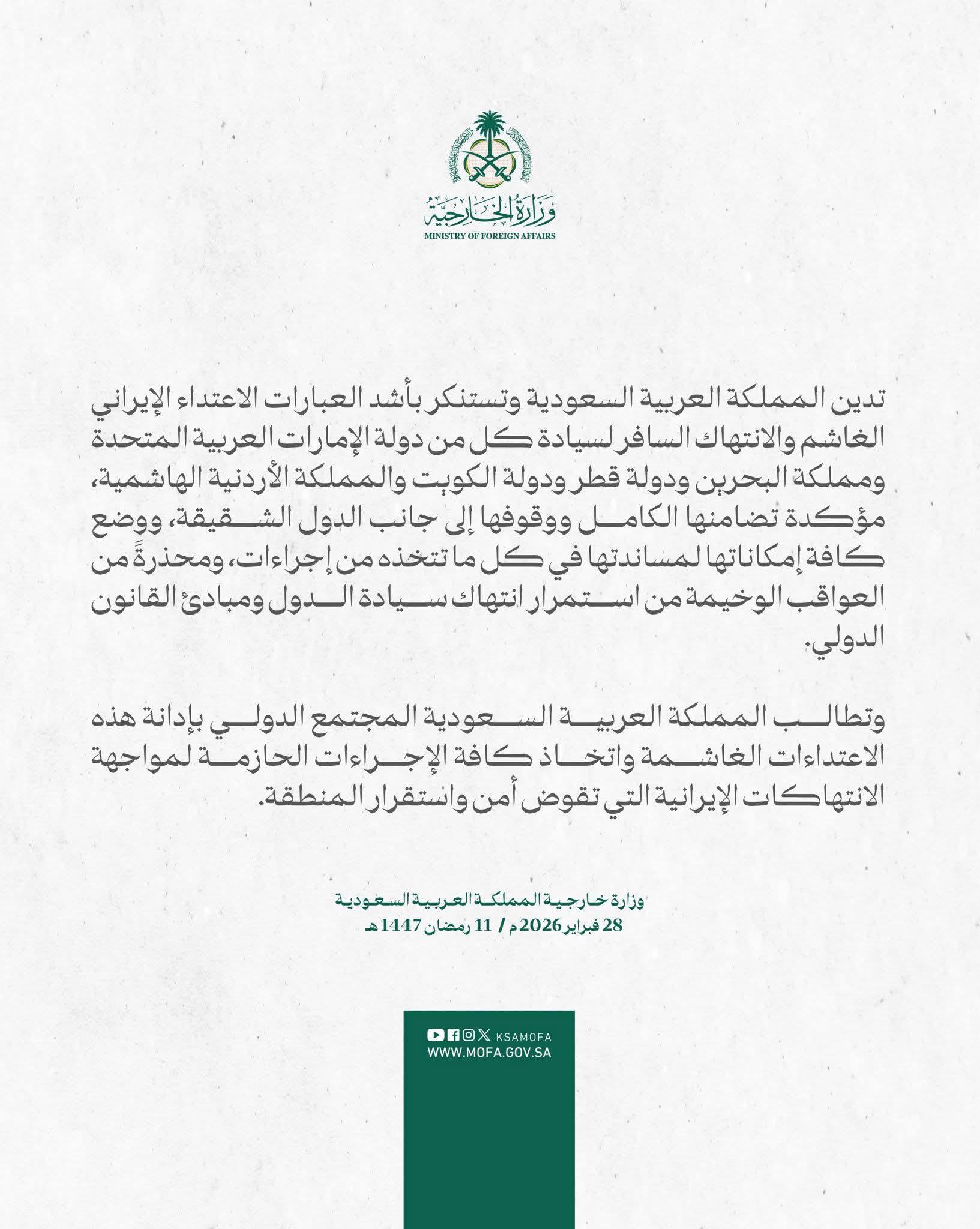 أعربت المملكة العربية السعودية عن إدانتها واستنكارها بأشد العبارات للاعتداء الإيراني الغاشم والانتهاك السافر لسيادة كل من دولة الإمارات العربية المتحدة، ومملكة البحرين، ودولة قطر، ودولة الكويت، والمملكة الأردنية الهاشمية، معتبرة هذه الأعمال التصعيدية مساساً خطيراً بالأمن القومي العربي واستقرار المنطقة.
