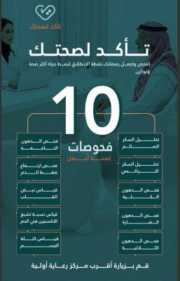 فعل مستشفى الملك فهد مبادره« تأكد لصحتك» في إطار جهود المستشفى المستمرة لتعزيز مفهوم الوقاية والكشف المبكر عن الأمراض، وتمكين أفراد المجتمع من الاطمئنان على أوضاعهم الصحية من خلال باقة متكاملة من التحاليل الطبية.