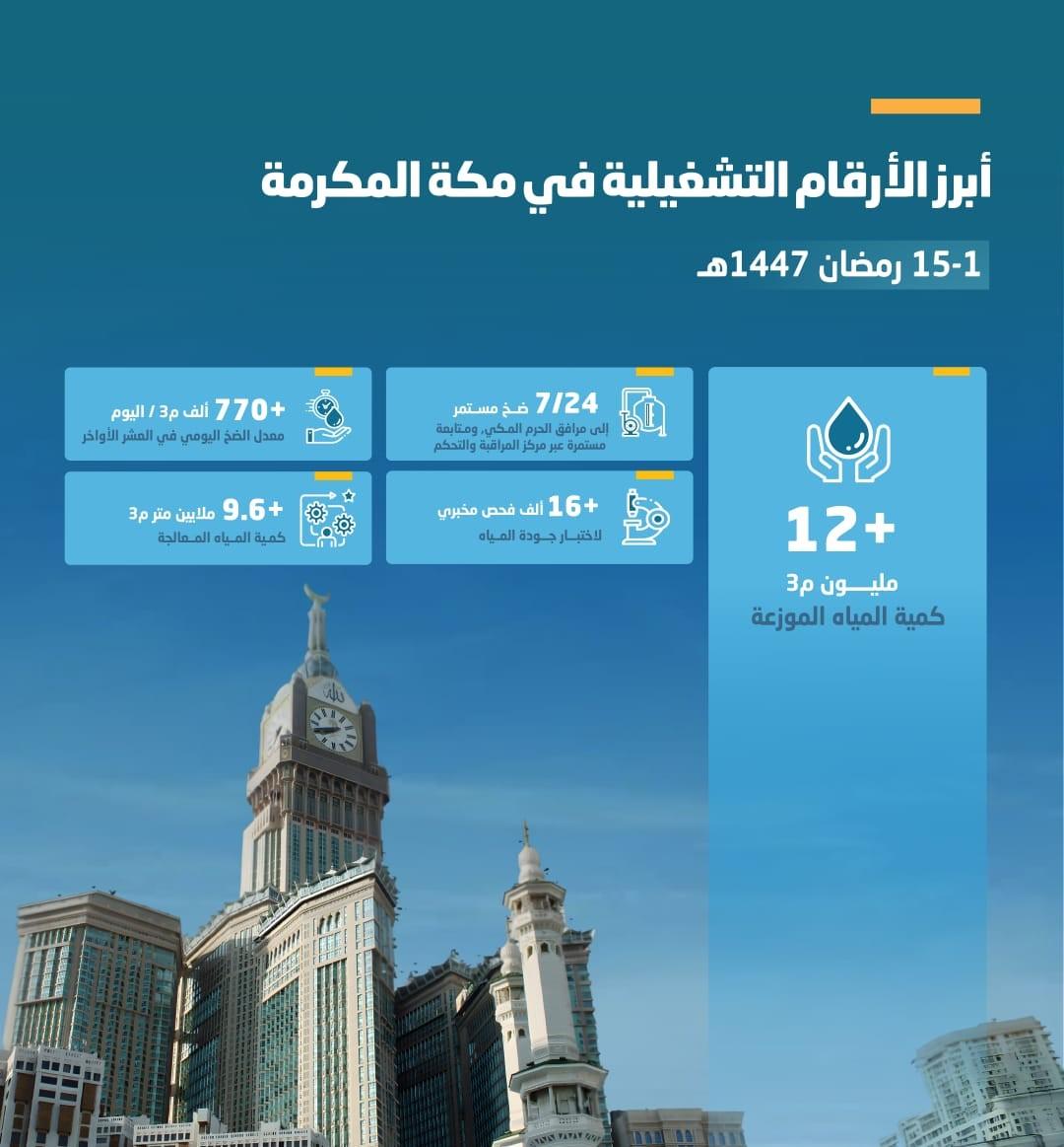 تواصل المياه الوطنية تنفيذ خططها التشغيلية لموسم شهر رمضان المبارك لعام 1447هـ والتي اتسمت بالانسيابية خلال النصف الأول من الشهر الفضيل ، حيث وزّعت أكثر من (12) مليون متر مكعب من المياه حتى 15 رمضان في مكة المكرمة ، وبضخ مستمر على مدار 24 ساعة للمسجد الحرام والمنطقة المركزية.