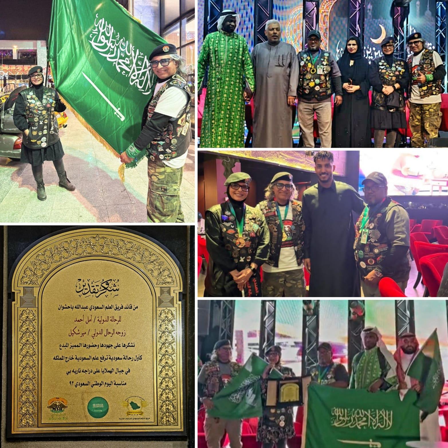 ضمن الفعاليات المقامة للاحتفال بيوم العلم السعودي وبالتعاون مع فريق العلم السعودي للدرجات النارية بقيادة الكابتن عبدالله قام الرحال الهندي الكابتن مير شكيل الرحمن وزوجته الرحالة السعودية الكابتن امل احمد بالمشاركة بالمسيرة التي ضمت جمعا من الرحالة والدراجين والفنانين كالفنان صالح الخلاقي والرياضين الكابتن نايف هزازي.