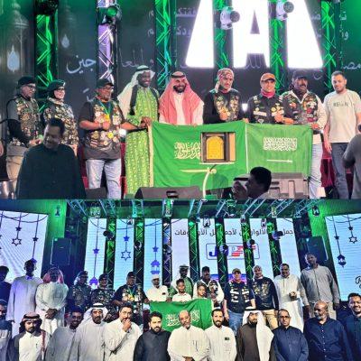 وفي ختام المسيرة تم تكريم الرحالة الكابتن امل أحمد وزوجها الكابتن مير شكيل الرحمن من قبل فريق العلم السعودي بدرع خاص بالمناسبة وقام المستشار عبد الرزاق فلاته مستشار الأولمبياد الخاص السعودي بتسليمهم الدرع وقام الجميع بعمل استعراض بالدراجات النارية امام جموع من العوائل والتي حضرت لتناول وجبة الإفطار الجماعي.