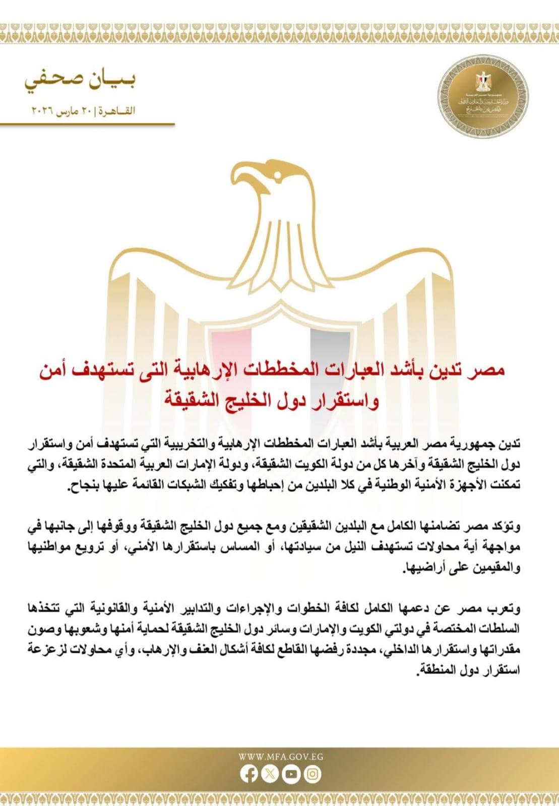 وأكدت مصر – فى بيان صادر عن وزارة الخارجية والتعاون الدولي والمصريين في الخارج اليوم الجمعة تضامنها الكامل مع البلدين الشقيقين ومع جميع دول الخليج الشقيقة ووقوفها إلى جانبها في مواجهة أية محاولات تستهدف النيل من سيادتها، أو المساس باستقرارها الأمني، أو ترويع مواطنيها والمقيمين على أراضيها.