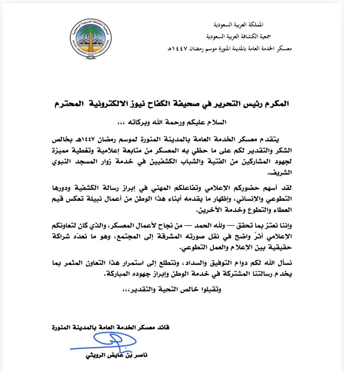 تعتز وتفتخر أسرة ،صحيفة الكفاح نيوز الإلكترونية ،بهذا التكريم و يعتبر وسام نفخر به ،من جمعية الكشافة العربية السعودية ،مفوضية خدمة وتنمية المجتمع لمعسكر الخدمة العامة بالمدينة المنورة، لموسم رمضان لهذا العام 1447 ،على ما قدمته الصحيفة من تغطيات إعلامية مميزة ،لفعاليات وأعمال المعسكر ،والتي أسهمت بفضل الله في إبراز الجهود التطوعية ،التي قدمتها الفتية والشاب الكشفيون في خدمة ضيوف الرحمن.
