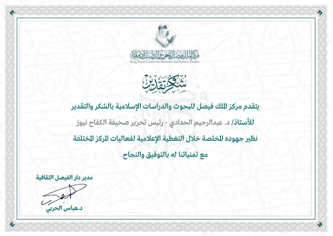 تعتز وتفخر صحيفة الكفاح نيوز الإلكترونية ،بكافة أعضائها على رأسهم رئيس التحرير ،بهذا التكريم من مركز الملك فيصل للبحوث والدراسات الإسلامية ،بشهادة الشكر والتقدير بأسم رئيس التحرير ،نظير الجهود المخلصة ،خلال التغطية الإعلامية ،لفعاليات المركز المختلفة.