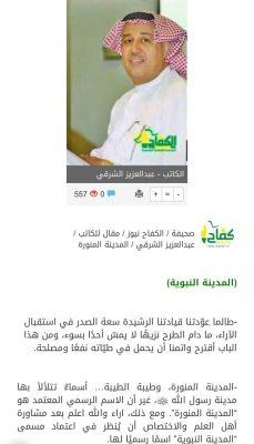 وفي نهاية الرد من الدكتور البكري للكاتب عبدالعزيز الشرقي أكد الدكتور – البكري أنه بصدد الكتابة عن هذا الموضوع بما يتعلق بأسم المدينة المنورة.