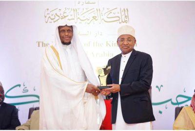 وشرف الحفل فخامة رئيس زنجبار السيد حسين علي مويني، بحضور فضيلة المستشار بوكالة وزارة الشؤون الإسلامية الشيخ محمد بن عبدالواحد العريفي الذي ناب عن معالي وزير الشؤون الإسلامية والدعوة والإرشاد الشيخ الدكتور عبداللطيف بن عبدالعزيز آل الشيخ في حضور الحفل الختامي لتكريم الفائزين بالجائزة، كما حضر الحفل فضيلة إمام المسجد الحرام الشيخ الدكتور بدر بن محمد التركي، ومفتي تنزانيا الدكتور أبو بكر الزبير، وسفير خادم الحرمين الشريفين لدى تنزانيا الأستاذ يحيى عكيش، وعدد من القيادات الدينية والرسمية.