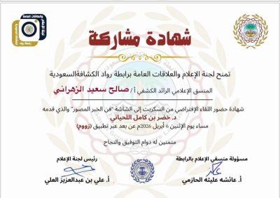قدم مدير مكتب رواد ورائدات كشافة محافظة جدة تهنئته للزميل الرائد الكشفي/ صالح سعيد الزهراني منسق و ممثل الإعلام بمكتب رواد ورائدات كشافة محافظة جدة، وذلك لحصوله على شهادة مشاركة في الدورة التدريبية “من السكربت إلى الشاشة فن الخبر المصور”.