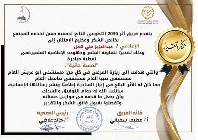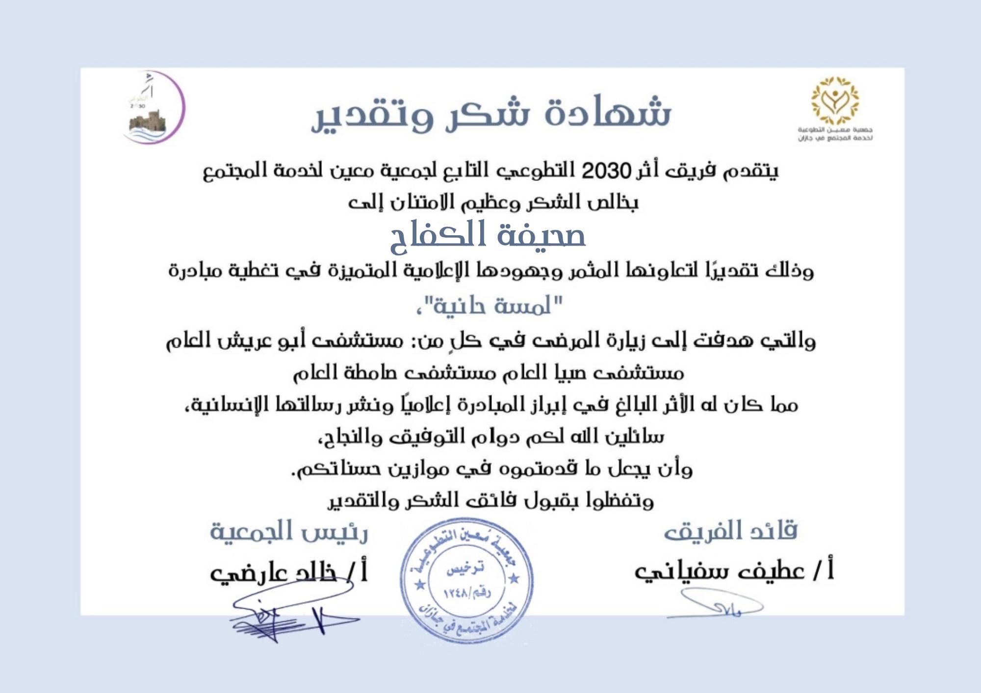 فريق أثر 2030 التطوعي التابع لجمعية معين لخدمة المجتمع يكرم صحيفة الكفاح نيوز ومراسلها في جازان الإعلامي – عبدالعزيز قحل بشهادتي شكر وتقدير.