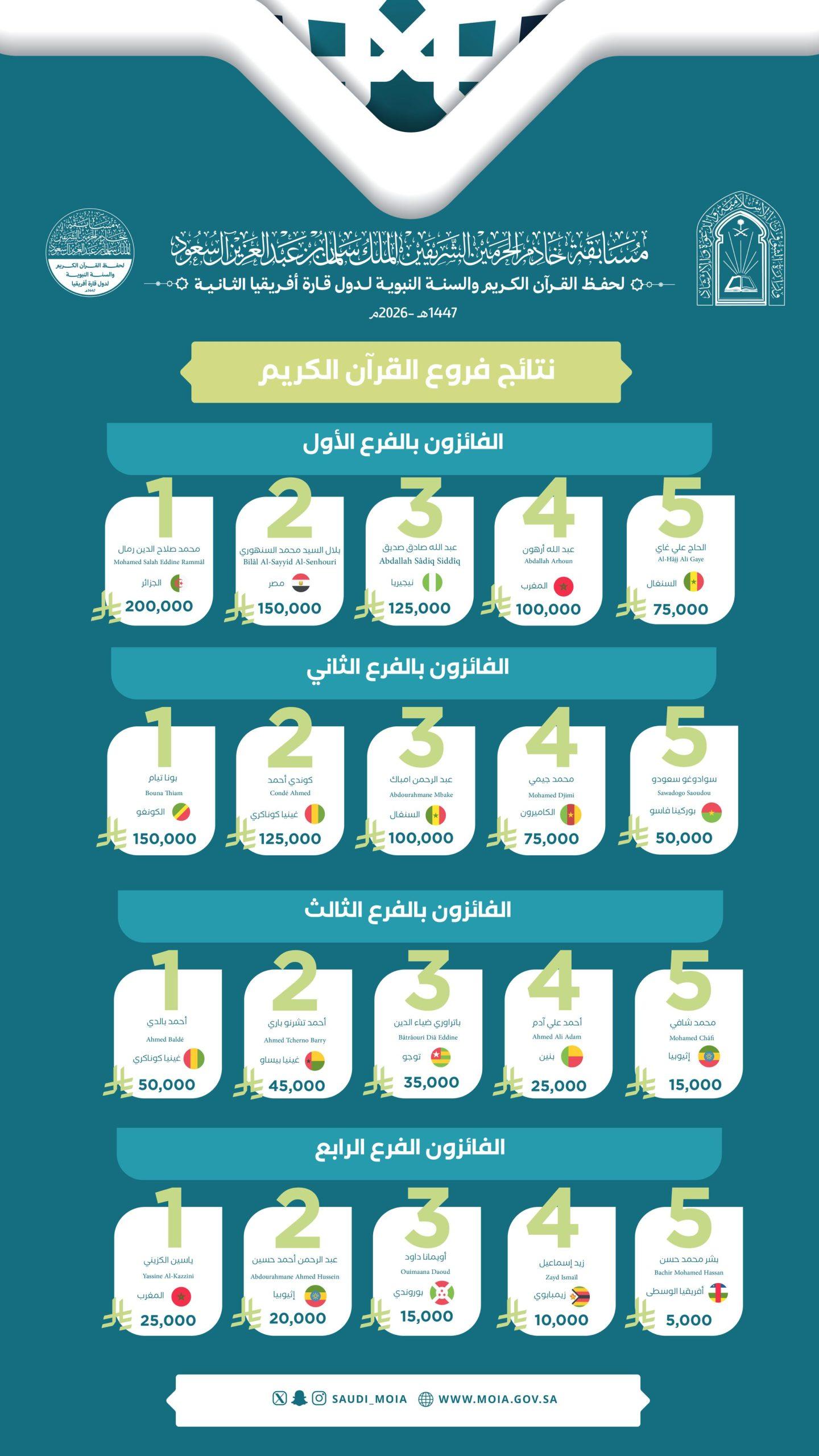 أسماء الفائزين في مسابقة خادم الحرمين الشريفين لحفظ القرآن الكريم والسنة النبوية لدول قارة أفريقيا الدورة الثانية التي نظمتها وزارة الشؤون الإسلامية بجمهورية السنغال بمشاركة 53 دولة أفريقية.
